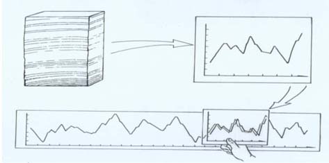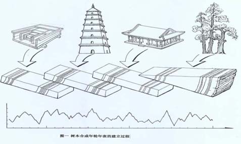 树干横截面上木质疏密相间的同心圆圈,就是通常所说的年轮。多数温带树种一年形成一个年轮,因此年轮的数目就表示树龄的多少,年轮的宽窄与相应生长年份的气候条件密切相关,在干旱年份树木生长缓慢,年轮就窄,反之则宽。同一气候区内同种树木的不同个体,在同一时期内年轮的宽窄规律是一致的。如果一段树干内层的一段年轮图谱同另一段树干外层的年轮图谱一致,就说明二者有过共同的生长期,生长年代能够相互衔接。如果我们以现在存活或已知砍伐年代的树木样本为时间基点,年代早一些的样本与之有一部分年轮图谱重叠,他们就可以衔接,就这样一直能衔接下去,甚至可以衔接到远古时期,这样就可以建立很长的树木年轮合成年表(图一)。